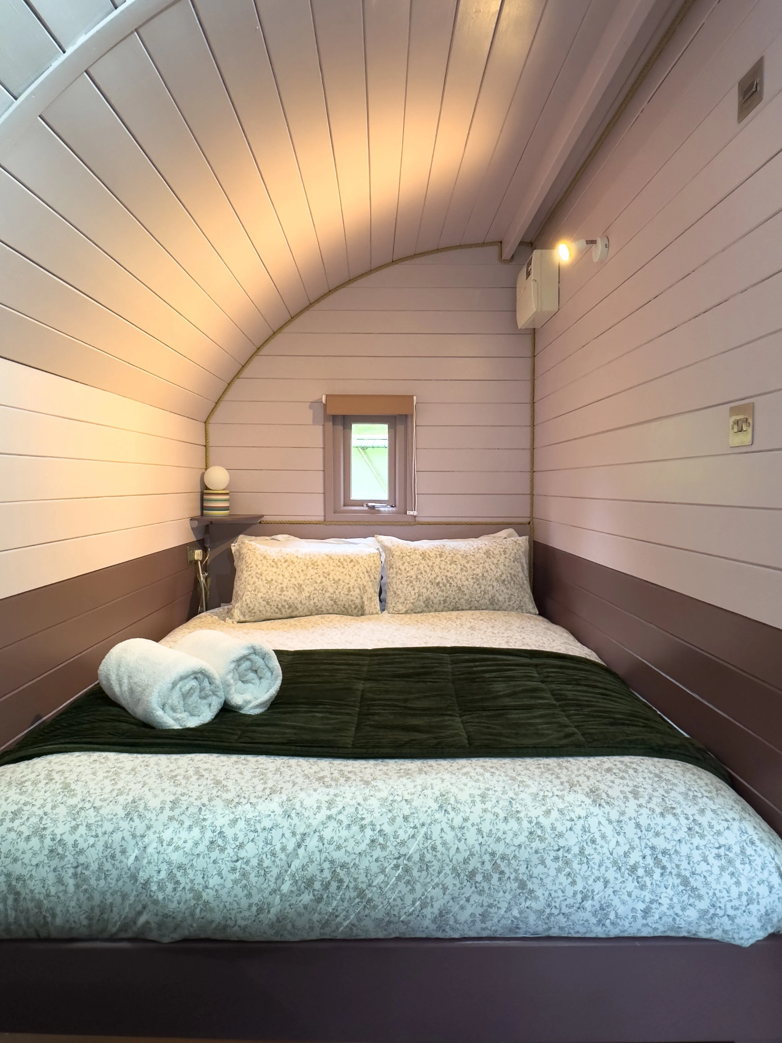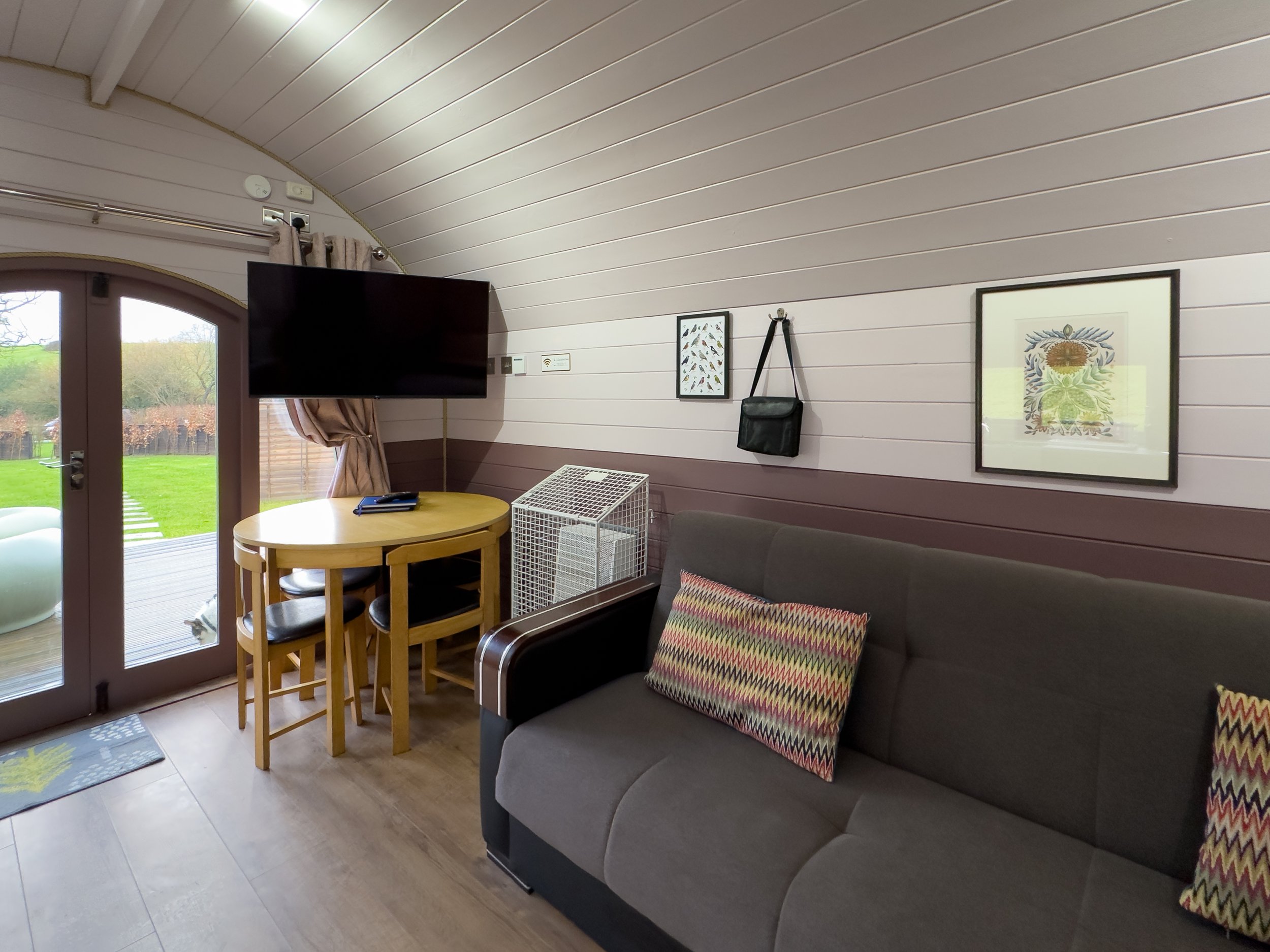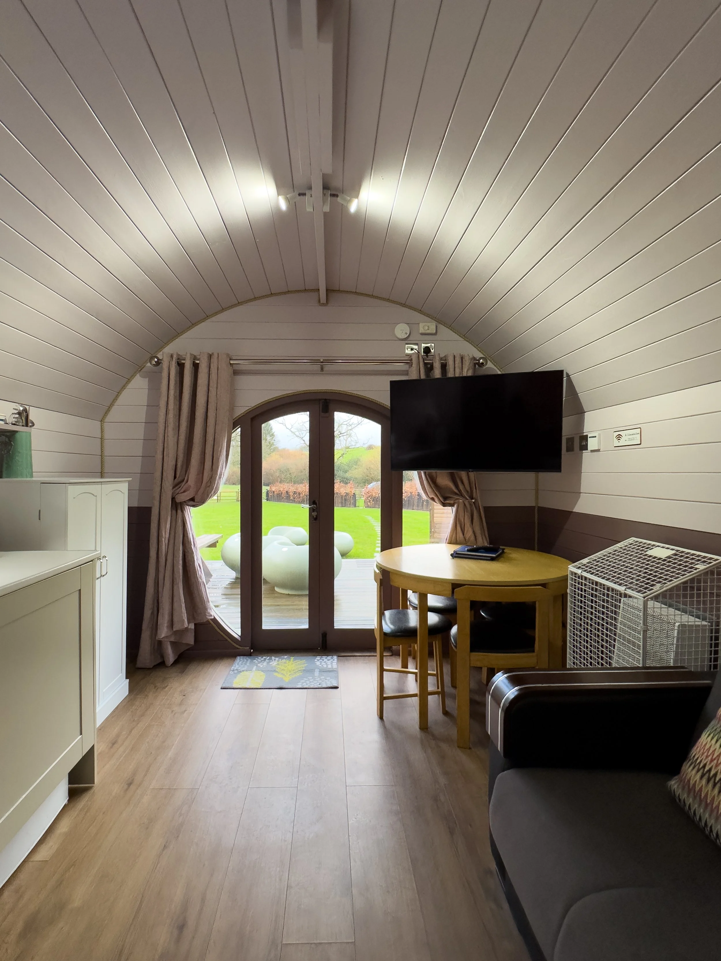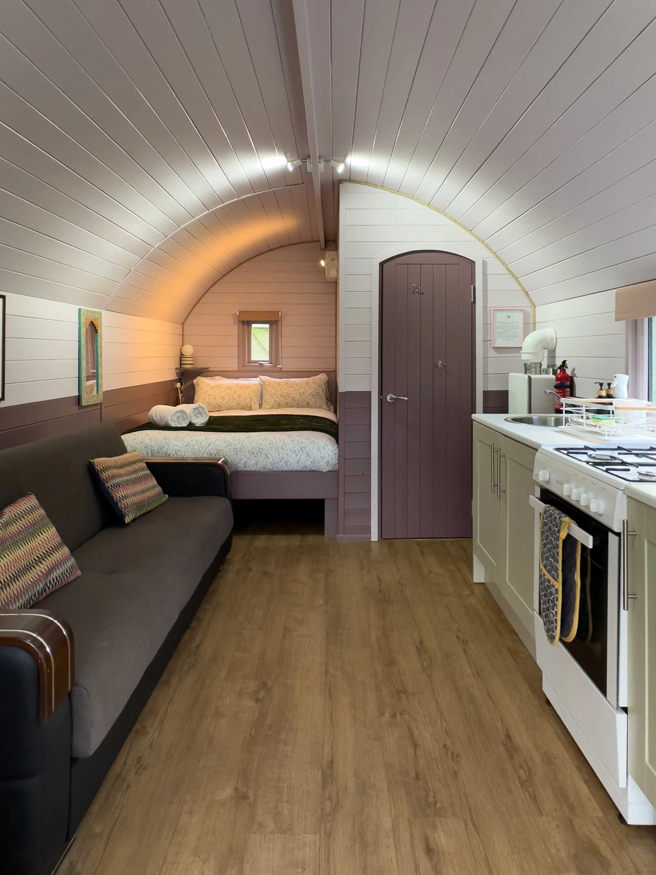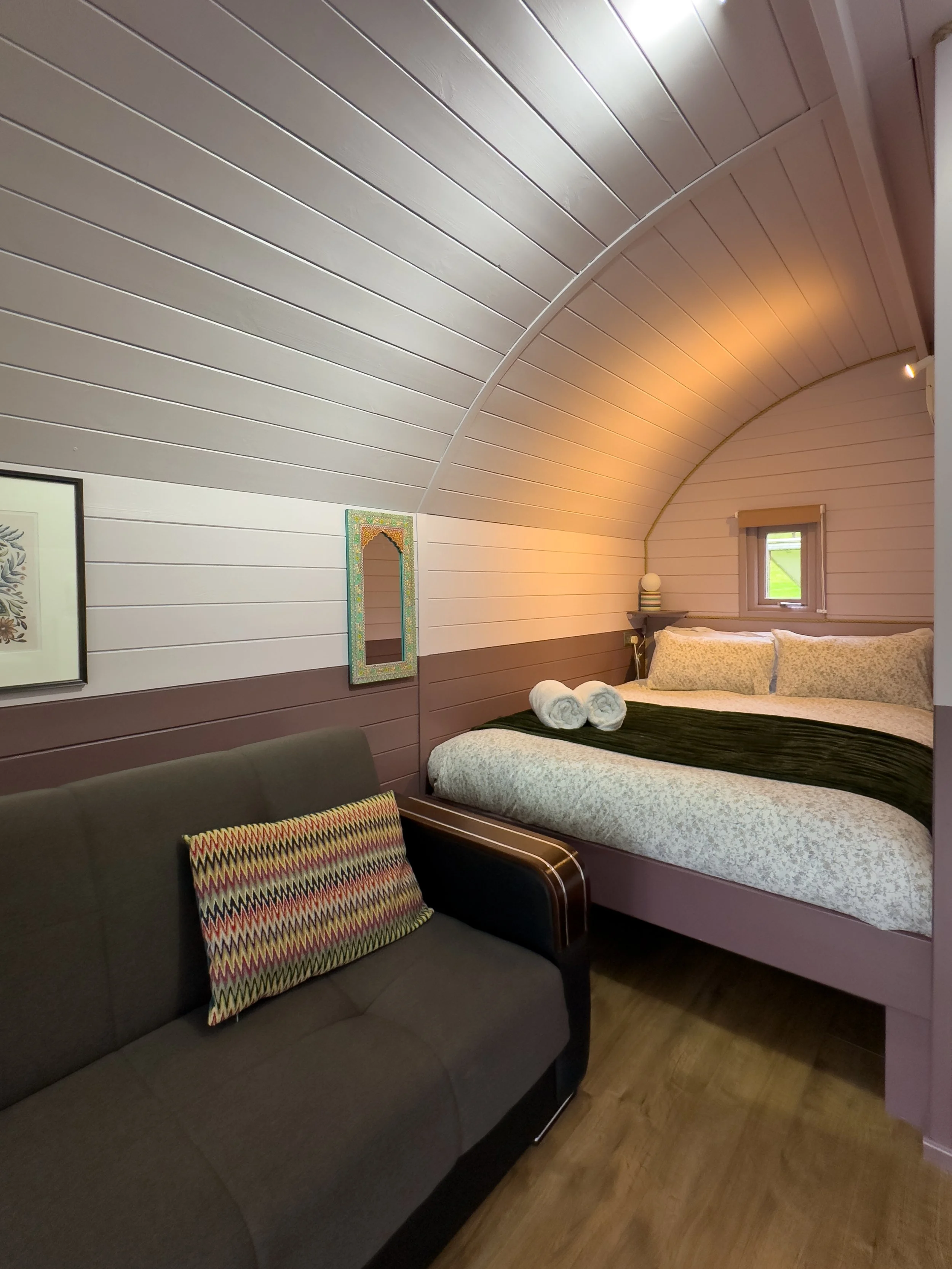 The Mainstay Pod at Hidden Wood Glamping is a peaceful hideaway set within a private half-acre paddock in the heart of the Corsley countryside. Designed for comfort and simplicity, it offers a cosy base for couples, families, and guests bringing dogs. The space feels calm and secluded, with woodland and open fields surrounding the pod and plenty of room to unwind. Inside, the pod features a comfortable king-size bed and a pull-out sofa bed for children, along with a well-equipped kitchenette, a modern bathroom with a hot shower, and heating to keep the space warm throughout the year. Bedding, towels, and everyday essentials are provided so you can settle in straight away.