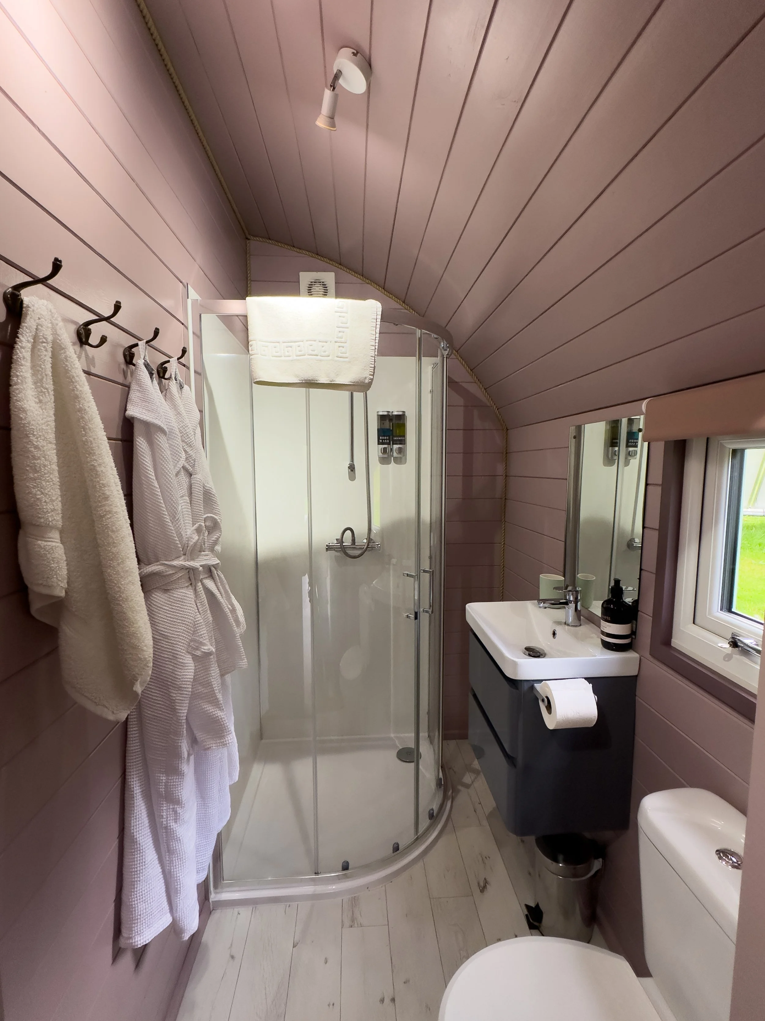 Shower room, complete with basin and toilet. We provide fresh towels, toilet rolls, shower gel, shampoo and two cozy dressing gowns. For added convenience, a toddler seat is available to accommodate our younger guests.